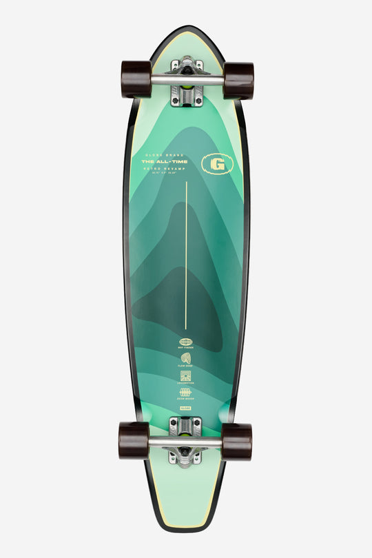 The topographic "Seascape" All-Time is a classic medium-length longboard in Resin 8-ply hard rock maple best used for cruising, getting to class or around town. This board is 9" wide x 35.75" length x 22.25" wheelbase, is easy to push straight for long distances and the tail makes it easier to turn when you get to a corner. It comes with Slant Reverse-kinpin trucks, 65mm 78a Conical Cruiser wheels, and Abec-7 bearings.